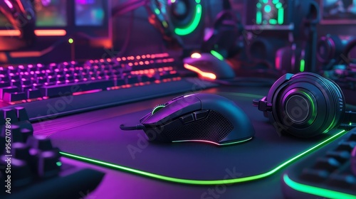 Gaming setup with mouse, keyboard, headphones, and mousepad on a desk with neon lights.