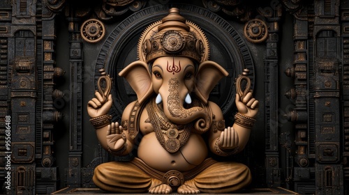 Ganesha with steampunk detailing, clockwork elements, and exposed gears, set in an industrial temple