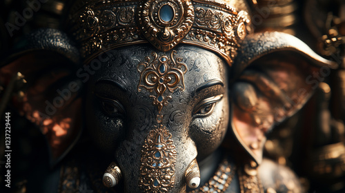 Ganeshaâs crown adorned with shimmering jewels, with delicate engravings and divine symbols catching the warm temple light
