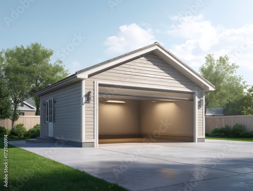 Garage Gateway: A contemporary two-car garage, its door open to the sunlight, inviting with a view of the building architecture.