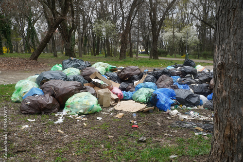 Garbage not picked up in Herastrau Park, Bucharest, Romania.
