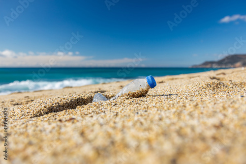 Garbage pollution of the planet. Empty plastic bottle on the beach sand. Consequences of human life