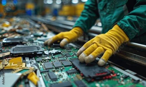 Garbage sorting and recycling concept. An employee is working on the conveyor for recycling and sorting garbage. Electronic waste, circuit boards, broken cell phones, screens and computers
