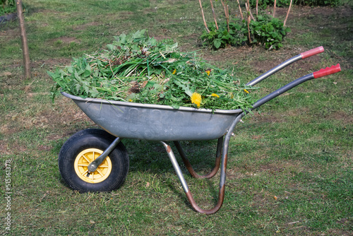 Garden cart with grass after mowing the lawn. Cleaning backyard work , distributing waste