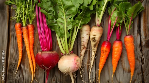 Garden Fresh Bounty: A vibrant array of freshly harvested root vegetables on a rustic wooden table, celebrating the earthy goodness of homegrown produce.