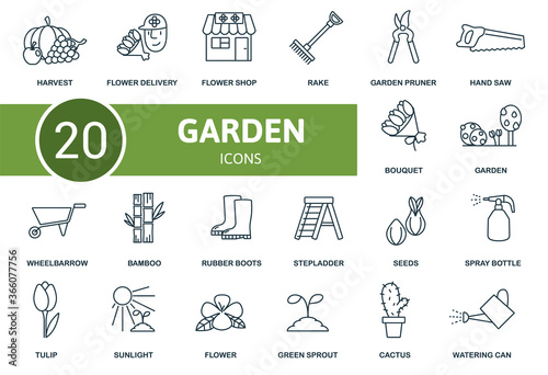 Garden icon set. Collection contain seeds, harvest, garden pruner, sunlight and over icons. Garden elements set.