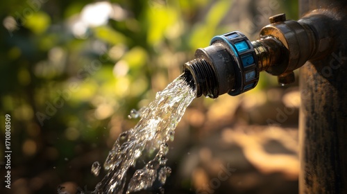 Garden irrigation pump showcasing a glassy water flow under warm daylight.