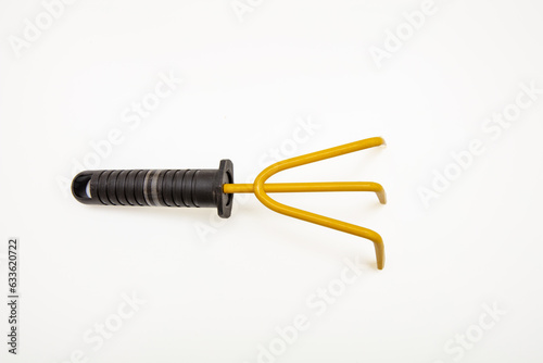 Garden rake yellow color isolated on white background, top view