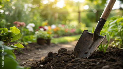 Garden Shovel Breaking Fresh Soil with Sunlit Green Plants and Natural Garden Background in Soft Focus