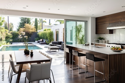 Garden view open kitchen with large table and light terrace with swimming pool