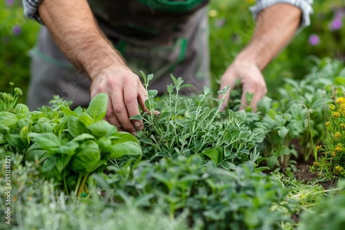 Gardener Carefully Tending to Fresh Herbs in Lush Green Garden During Sunny Day