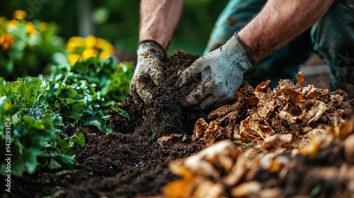 Gardener hands planting soil in garden bed