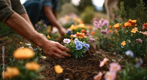 Gardener Planting Colorful Flowers in Garden Bed, Symbolizing Growth and Environmental Stewardship for a Sustainable Future : Generative AI