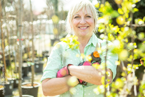 Gardener with pruner and plants
