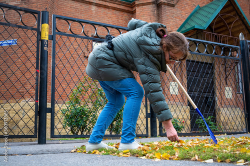 Gardener woman raking up autumn leaves. Woman standing with rake.