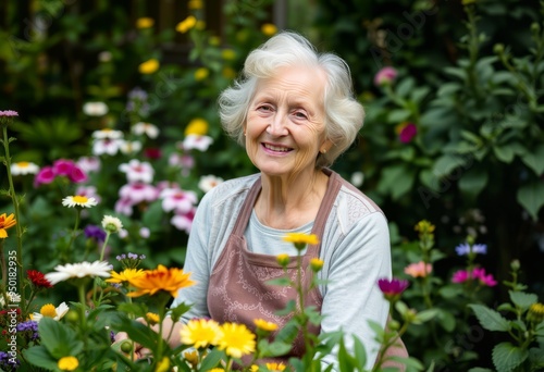 Gardener's Contentment An elderly woman surrounded by her flouri