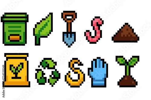 Gardening and farming pixel art icon set. Nature, agriculture, 8-bit icons collection.