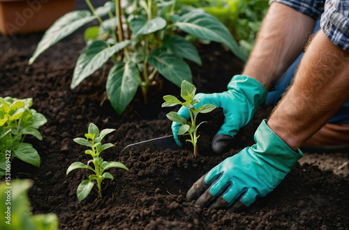 Gardening enthusiast planting new seedlings in a home garden during a sunny afternoon
