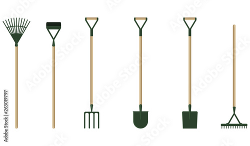 Gardening equipment - set of six items - shovels, rakes, forks - flat style - vector