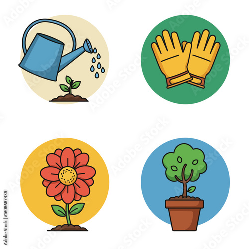 Gardening icons set with watering can gloves flower and potted tree