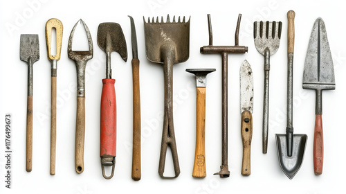 Gardening instruments with shovel, rakes and spading fork, axe and saw, trowel and forks, pruning knives and shears, wheelbarrow and buckets, watering can and sprayer