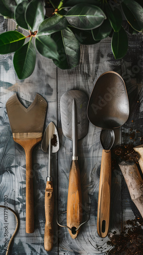 Gardening tools arranged neatly on a wooden surface with green leaves in background