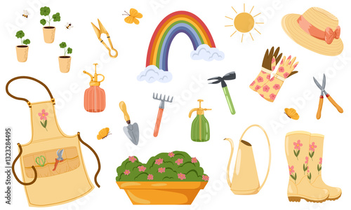 Gardening tools vector illustrations set. Hand drawn cartoon farm instruments, rubber boots, gloves, watering cans, plants, hat, apron, rainbow spring icons collection. Agricultural tools flat art