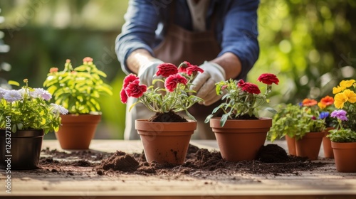 Gardening with vibrant blooms and care in a sunlit outdoor setting