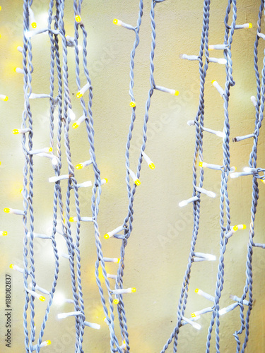 Garlands of lamps on the street against the wall. Elements of the decor of the night ceremony. Lights and lanterns in the evening. Christmas decoration