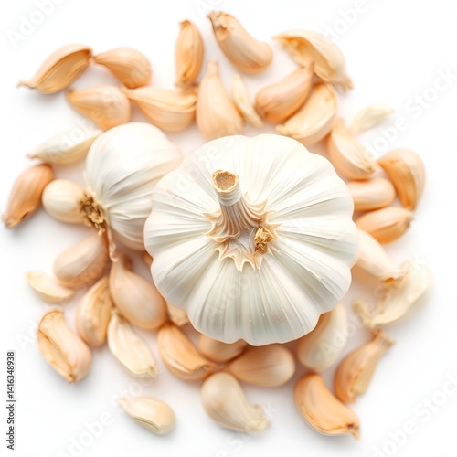 Garlic and cloves displayed on a white background as a fresh and natural cooking ingredient