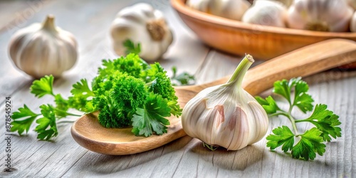 Garlic and Parsley on Wooden Spoon, Wooden Table, Close-Up, Fresh, Kitchen, Ingredients, Herb, Food, Recipe, Flavor, Aromatic, Aromatic, Natural, Raw