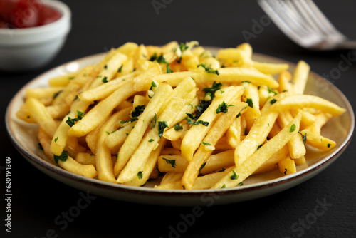 Garlic French Fries with Parsley on a Plate on a black background, side view. Close-up.