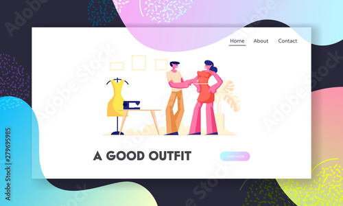 Garment Designer Website Landing Page, Dressmaker or Tailor Measuring Woman Customer Breast for Making Dress, Clothing Designer Working in Atelier Web Page. Cartoon Flat Vector Illustration, Banner