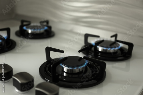 Gas burners with blue flame on modern stove