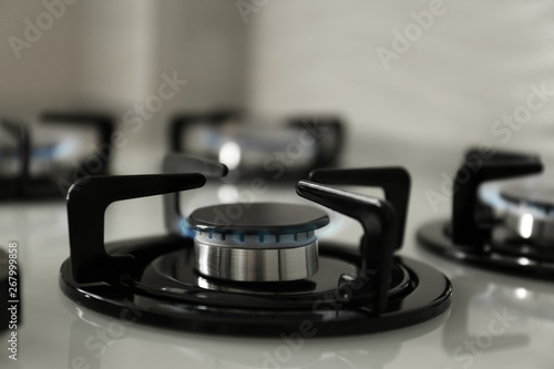 Gas burners with blue flame on modern stove, closeup