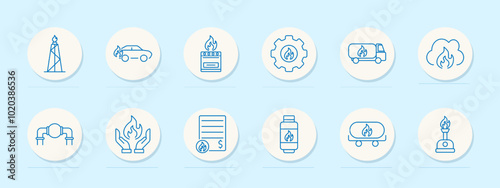 Gas safety set icon. Gas pipe, stove, fuel station with car, burning house, tank, oven, stove flame, gas valve, flame icon, alarm, cost , stove burners.