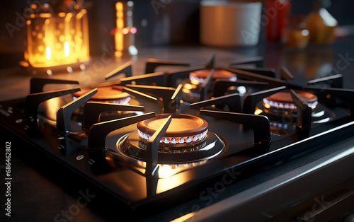 Gas stove with burning gas on the modern kitchen background. Close up of a gas stove