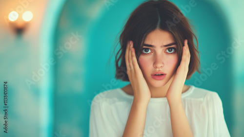 Gaslight manipulation toxic narcissism and abuse psychology concept. A young woman with a worried expression holds her face in her hands, set against a soft blue background that creates a calm, intros