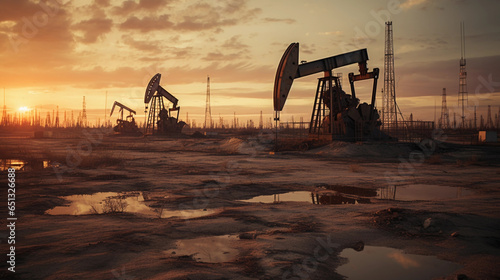 Gasoline oil industry. Petroleum gas creation. Oil pumps at sunset.