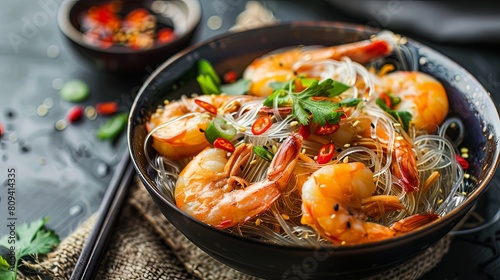Gastronomic Pleasure: Mouthwatering stir-fried shrimp with transparent noodles, an indulgent Asian culinary experience.
