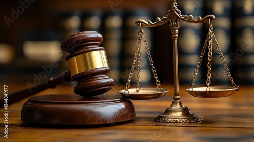 Gavel and scales of justice on a wooden table, symbolizing law.