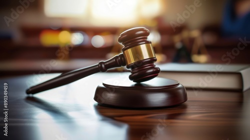 Gavel on table with blurred background, symbolizes legal themes, courtroom elements, justice and law setting