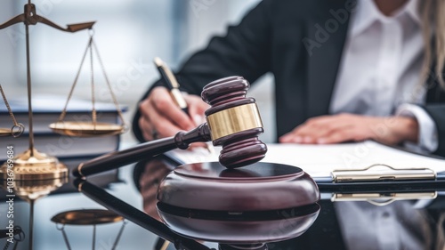 Gavel on table with legal documents, symbolizing justice and law.