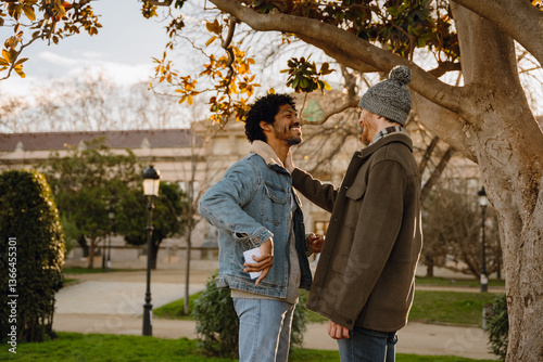 Gay couple, man standing and putting his hand on the neck of the man standing across from him, they are laughing and looking at each other, on the street