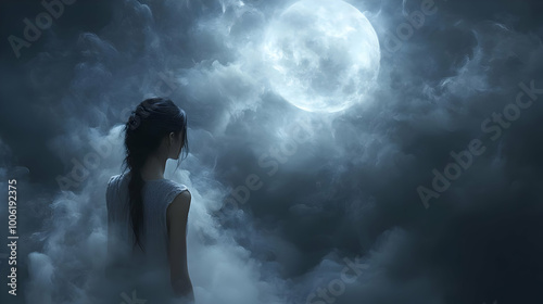 Gazing at the Moon Through the Clouds, Woman in a Dreamy Setting