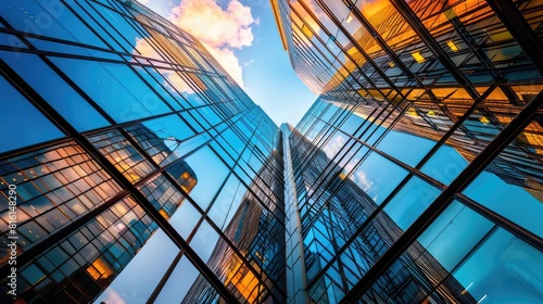 Gazing up at the impressive height of a modern skyscraper, its reflective glass exterior mirroring the sky above.