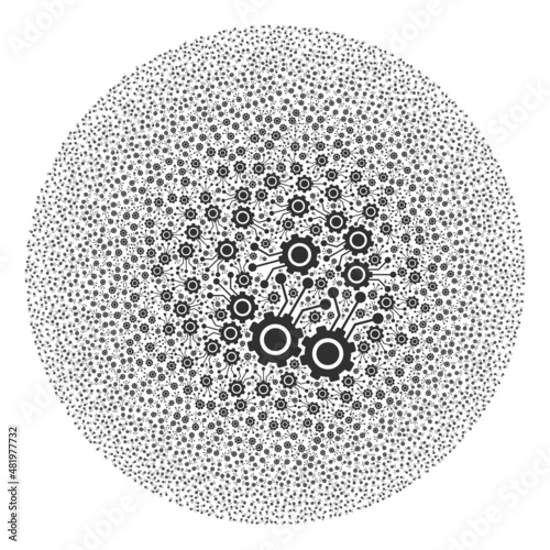 Gear connectors items are organized into round group. Gear connectors icon round collage. Abstraction round bubble collage is combined from gear connectors items.