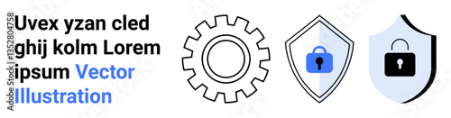 Gear, shield and lock icons symbolize system functionality, security, privacy, and data protection. Ideal for technology, cybersecurity, privacy, data safety system maintenance settings flat