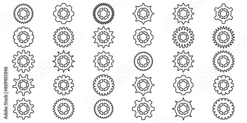 Gears icon set. Setting gears icon. Collection of mechanical outline cogwheels. Simple Gear wheel collection. Gear icons silhouette. Vector illustration with cogwheels sign set on white background.