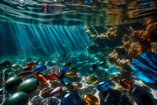 Gemstones in a crystal clear water of a lake reflecting the sunlight,